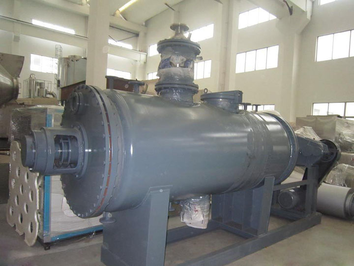 干燥機(jī)結(jié)構(gòu)簡單,操作方便,使用周期長,性能穩(wěn)定可靠,蒸汽耗量小,適用性能強(qiáng),產(chǎn)品質(zhì)量好,特別適用于不耐高溫、易燃、調(diào)溫下易氧化的膏狀物料的干燥,該機(jī)經(jīng)用戶長期使用證明是一良好的干燥設(shè)備。原理:被干燥物料從殼體上方正中間加入,在不斷正反轉(zhuǎn)動(dòng)的耙齒的攪拌下,物料軸向來回走動(dòng),與殼體內(nèi)壁接觸的表面不斷新,受到蒸汽的間接加熱,耙齒的均勻攪拌,粉碎棒的粉碎,使物料表面水分有利的排出,氣化的水分經(jīng)干式除塵器、濕式除塵器、冷凝器,從真空泵出口處放空。
